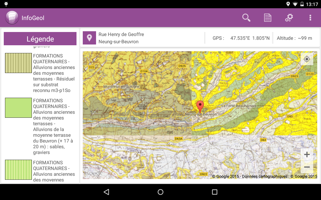 Plus restreinte, mais beaucoup plus rapide que l'application InfoTerre, InfoGéol permet de savoir sur quel type de formation vous vous trouvez, puis de télécharger la notice pour avoir tous les détails complémentaires. BRGM - InfoGéol